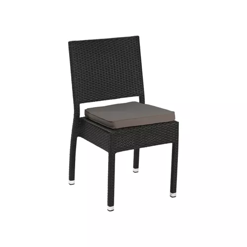 Mond S ist ein Outdoor-Stuhl für den HORECA-Bereich, mit pulverbeschichtetem Aluminiumrahmen und Sitz/Lehne aus flachem schwarzem Kunststoffgeflecht. Witterungs- und UV-beständig, bis zu 8 Stück stapelbar – ideal für Außengastronomie.