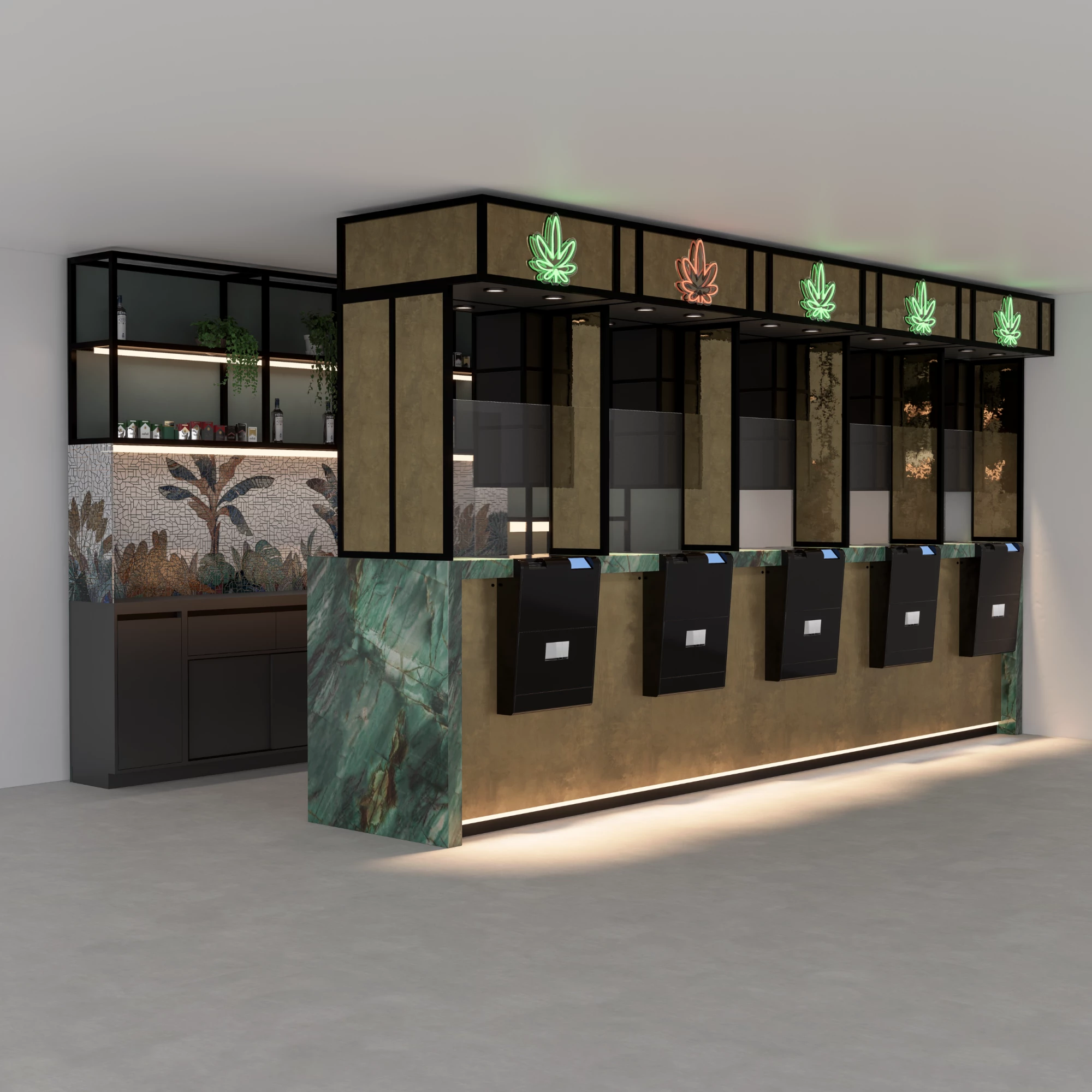 Ein markantes, modernes Barkonzept, geprägt von starken Kontrasten, edlen Materialien und einem Hauch von dezentem Luxus. Die Servierplatte und die Seitenwände sind aus Marmor in der Farbe Rainforest Green gefertigt und bieten eine eindrucksvolle, natürliche Textur mit warmen, erdigen Maserungen, die sofort zum optischen Mittelpunkt des Designs wird.