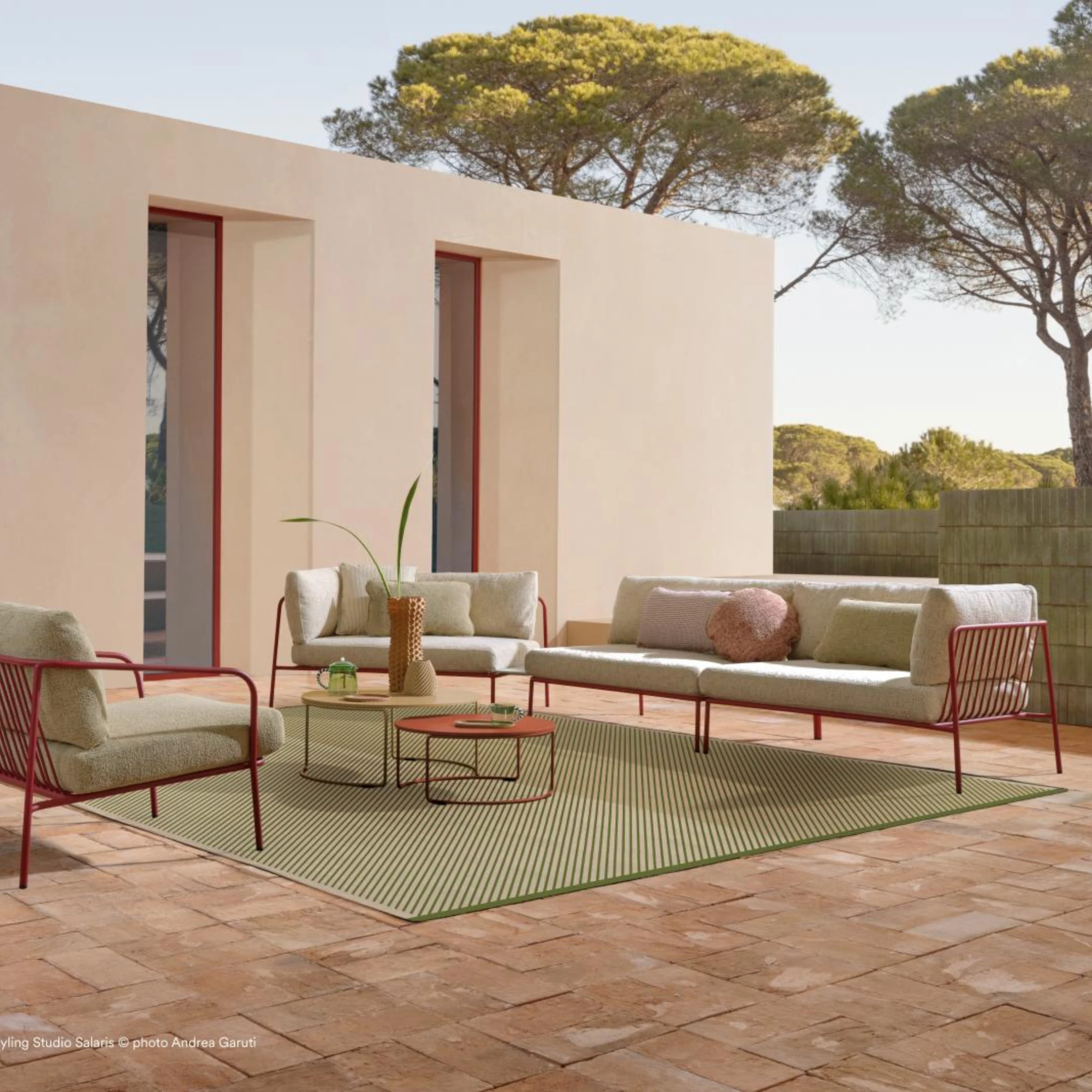 Das Eckelement besteht aus einem pulverbeschichteten Stahlrohrrahmen, der für den Außenbereich konzipiert ist. Sitzkissen aus Polyurethanschaum und Rückenkissen aus weichem Polyester sind mit einem wasserdichten Futter geschützt und mit wetterfesten Stoffen oder Polypropylen bezogen. Ein Seitenkissen kann hinzugefügt oder weggelassen werden, sodass sich die Komposition flexibel an den Raum anpasst.