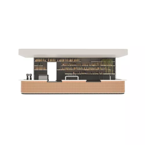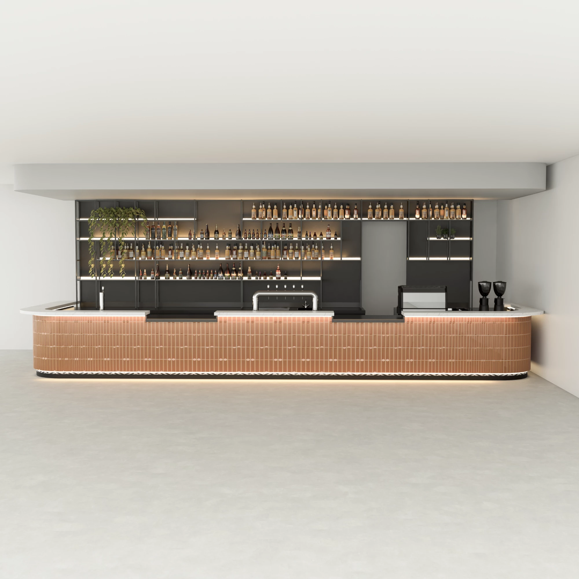 Ein eingelassener, LED-beleuchteter Sockel erzeugt einen schwebenden Effekt und ein sanftes Leuchten, das die Struktur der Bar hervorhebt, ohne die Atmosphäre zu dominieren.