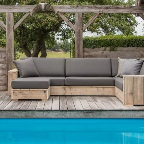 Sofa aus Kiefernholz mit unbehandelter Oberfläche, ideal für den Außenbereich. Erhältlich in White Wash, Black Wash oder transparenter Beschichtung. Die Kissen sind aus Outdoor-Stoffen in verschiedenen Farben erhältlich.