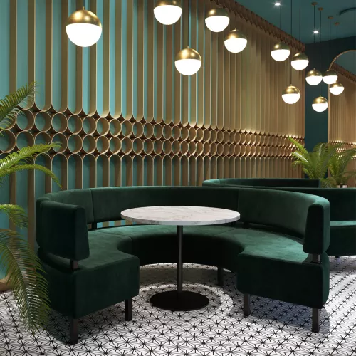 Die Rado Halbkreisbank ist die perfekte Wahl für stilvolle Restaurants, Bistros und Cafés. Ihr eleganter, geschwungener Look bringt Dynamik und Gastlichkeit in jeden Raum. Ob als Blickfang in der Mitte oder entlang der Wand – Rado schafft einladende Sitzbereiche, die Kommunikation fördern und Komfort bieten. Mit hochwertiger Polsterung und stabilem Buchenholzrahmen kombiniert diese Bank Langlebigkeit mit modernem Design. Ideal für Gastronomen, die auf ein stilvolles und funktionales Ambiente setzen.