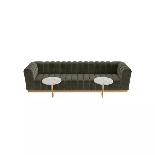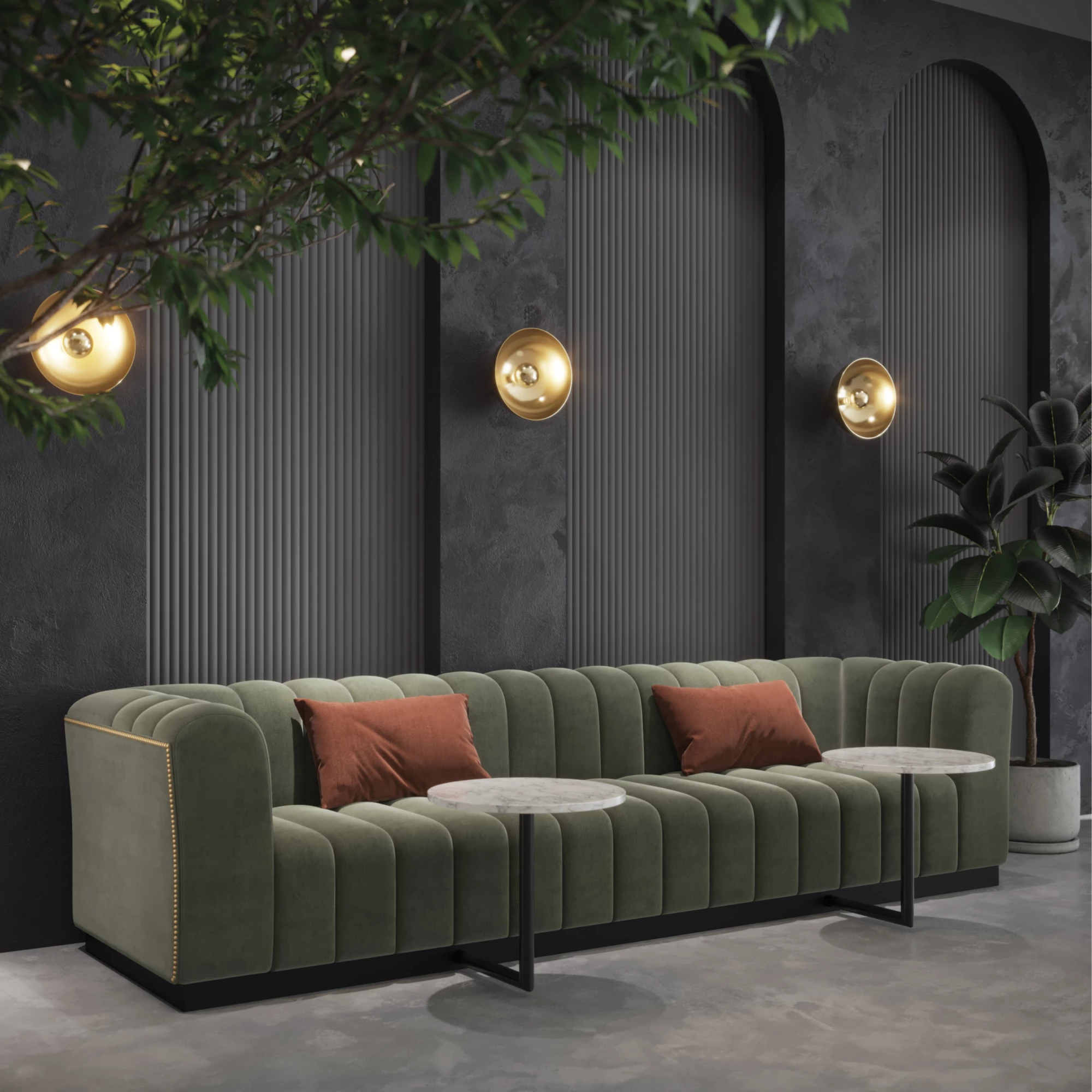 Die Roll Bench ist eine maßgefertigte Sitzbank mit zwei 210 mm breiten Armlehnen an beiden Seiten. Der Sockel besteht aus schwarz gebeiztem Eichenfurnier, mit einem polierten Messingsockel in HPL 874 Satinata, auch auf der Rückseite. Wahlweise mit oder ohne Messingrohren zur Tischverbindung. Hochwertiger Schaumstoff, verstärkte Ecken und Nosag-Federn sorgen für hohen Sitzkomfort. Bezogen mit Velours, auch auf der Rückseite, und veredelt mit antiken Messingnägeln – stilvoll und robust zugleich.