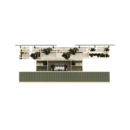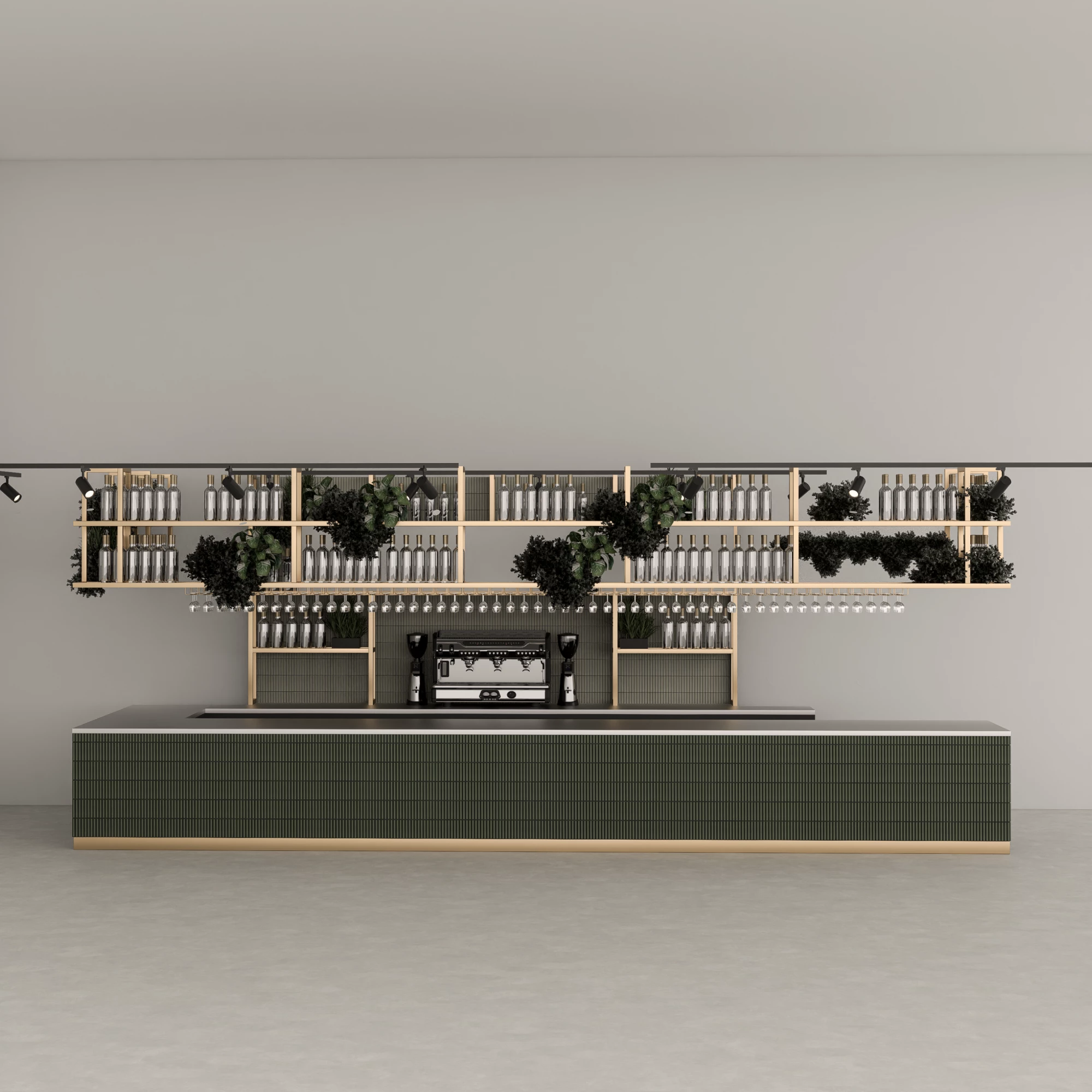 Über der Theke setzen der Hänge- und der Rückwandrahmen – gefertigt aus 4 x 4 cm großem, pulverbeschichtetem Metall in Goldoptik – einen luxuriösen Akzent. Ihre geometrische Schlichtheit verleiht dem Raum Eleganz und rahmt die Ausstellungsfläche dezent ein.