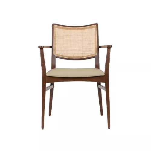 Soul A Wicker ist ein eleganter Holzstuhl mit Armlehnen, Buchenholzrahmen in verschiedenen Beiztönen, gepolsterter Sitzfläche und Rückenlehne aus Wiener Geflecht. Klassisch, bequem und vielseitig – perfekt für HORECA-Räume jeder Art.