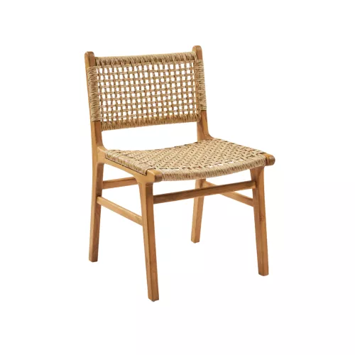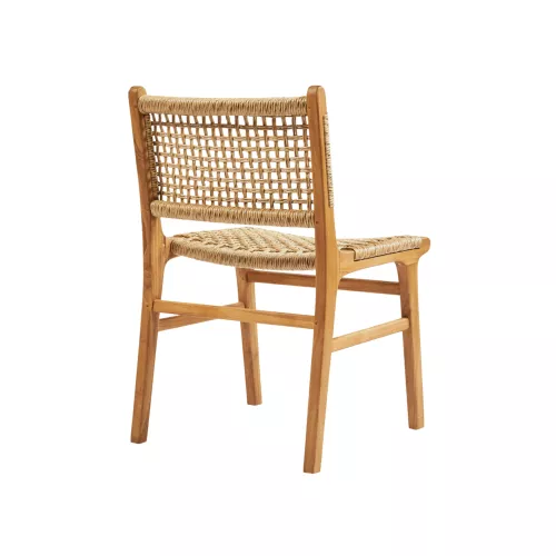 Stuhl aus Teakholz mit Sitz und Rückenlehne aus geflochtenem synthetischem Rattan. Die Kombination aus massivem Holz und strapazierfähigem Geflecht sorgt für eine natürliche Optik und eignet sich ideal für den Einsatz in Gastronomie- und Objektbereichen, sowohl im Innen- als auch im Außenbereich.