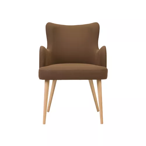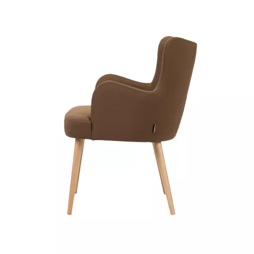Tavro ist ein Holzstuhl mit Armlehnen im eleganten Mid-Century-Stil. Der Rahmen besteht aus massiver Buche in verschiedenen Beizfarben. Sitz und Rücken sind mit professionellen Stoffen oder Kunstleder gepolstert – perfekt für HORECA-Einsätze.