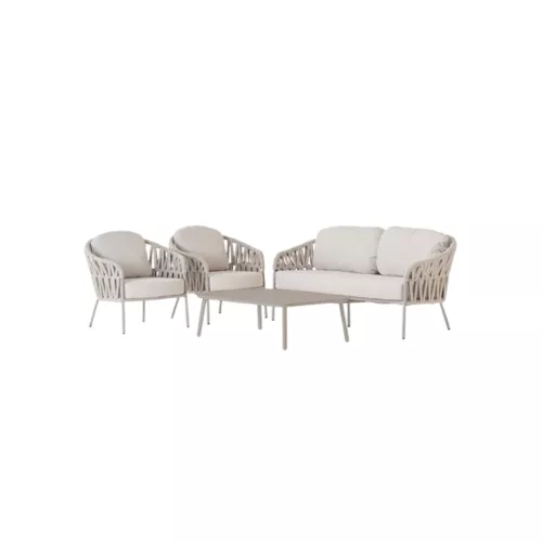 Werten Sie Ihren Außenbereich mit diesem stilvollen und robusten Wohnset auf, das Komfort und Eleganz vereint. Gefertigt aus hochwertigem Aluminium und veredelt mit Polyester- und Gummiseil, bietet es ein modernes Design und ist gleichzeitig äußerst langlebig. Das Set umfasst ein geräumiges Sofa, zwei bequeme Lounge-Sessel und einen eleganten Tisch mit Aluminiumplatte – perfekt zum Entspannen oder für gesellige Stunden. Die Kissen sind aus hochwertigem Olefin-Gewebe mit wasserabweisenden Eigenschaften gefertigt und somit ideal für den Einsatz im Freien bei unterschiedlichen Wetterbedingungen. Zusätzlich enthält das Set einen Victory-Sandstuhl und einen Atol-Sessel, die für weitere Sitzgelegenheiten und Flexibilität sorgen. Dieses Komplettset wird zum Festpreis angeboten und ist nicht als Einzelartikel erhältlich – die perfekte All-in-One-Lösung für Ihren Außenbereich.